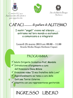 In occasione della Giornata Mondiale dell´Autismo, istituita dall´Assemblea Generale delle Nazioni Unite nel 2008 e che si celebra annualmente il 2 Aprile, l´Amministrazione comunale su proposta del comitato "L´autismo parla", nato a Palermo nell´ottobre 2009, promuove un incontro informativo sulla tematica dal titolo "CAPACI...di parlare di AUTISMO" al fine di sensibilizzare gli alunni delle classi terze della SSPG Biagio Siciliano.